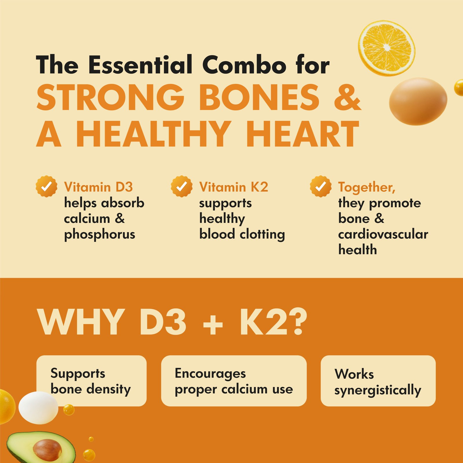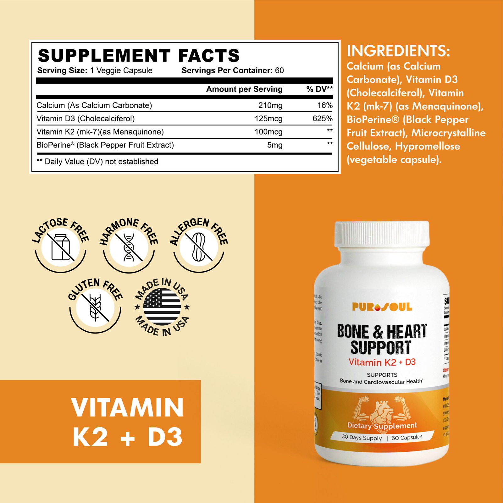 - Vitamin K2 (MK-7 as Menaquinone) – 100 mcg: Works with Vitamin D3 to direct calcium to bones and prevent calcium buildup in arteries.
