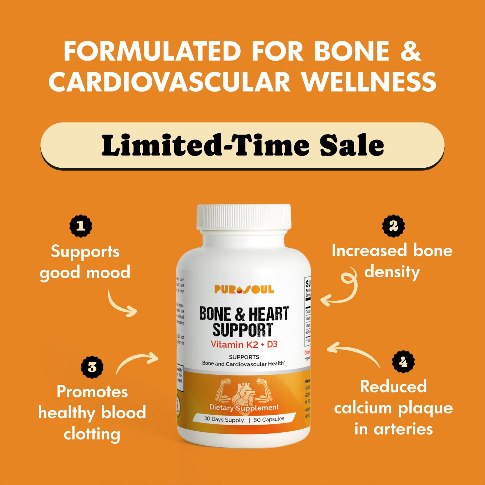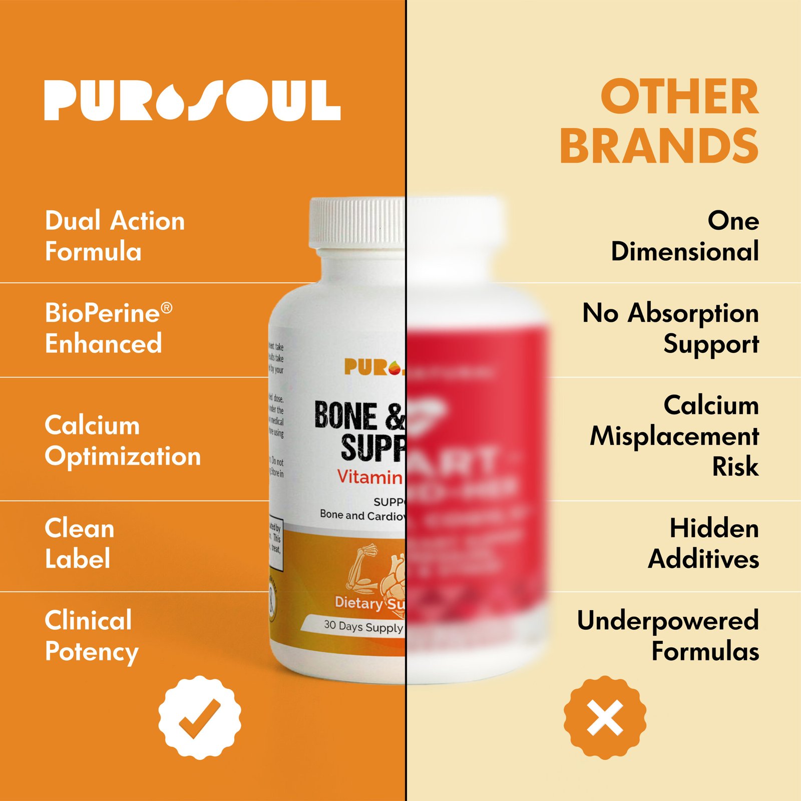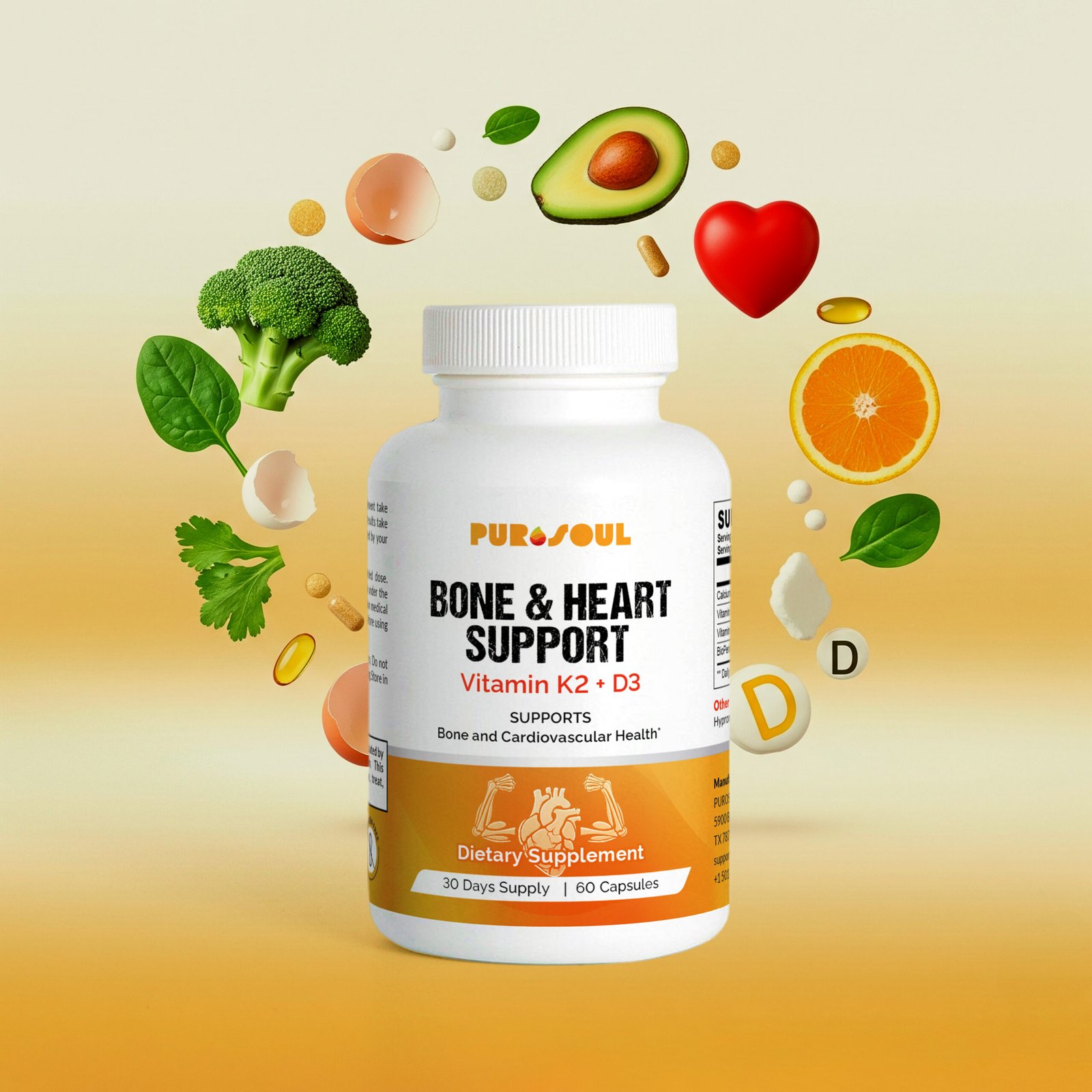 At PuroSoul, we know true health means supporting the systems that keep you moving and thriving. Our Bone & Heart Support formula is designed to fortify your bones while helping maintain optimal cardiovascular function. With a precise blend of Calcium, Vitamin D3, Vitamin K2, and BioPerine®, it works to enhance calcium absorption, direct it to where your body needs it most, and support circulation—keeping you strong, steady, and active every day.