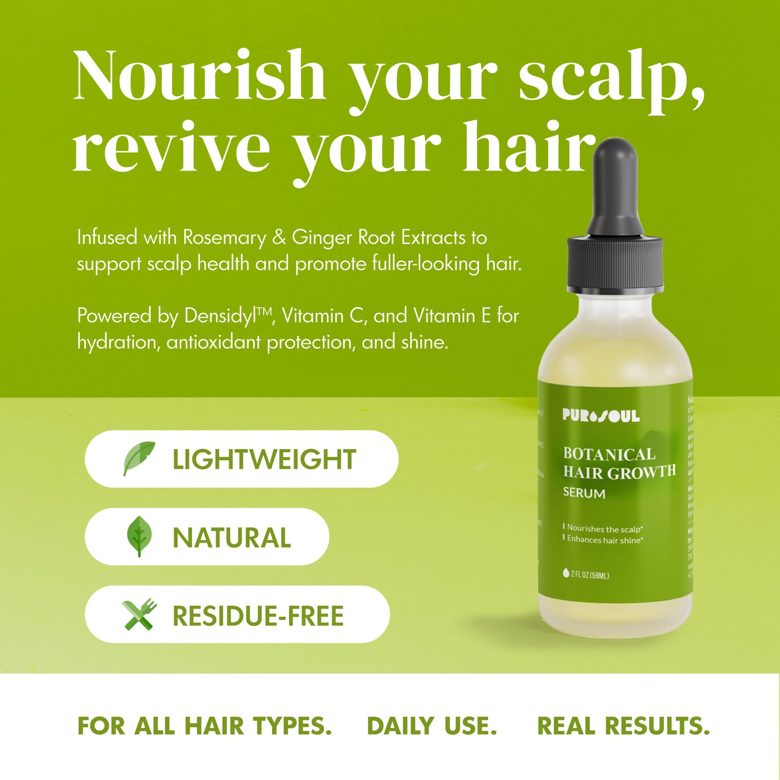 PuroSoul Botanical Hair Growth Serum delivers a targeted blend of Rosemary & Ginger Root Extracts, Densidyl™, Vitamin C, and Vitamin E to revitalize your scalp, strengthen roots, and promote fuller, shinier hair. Lightweight and residue-free, it absorbs quickly, delivering hydration and antioxidant protection without weighing your hair down.