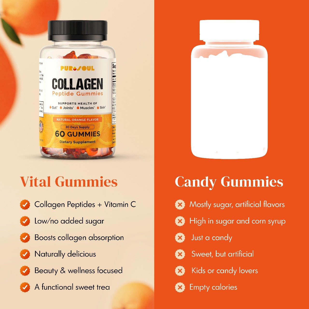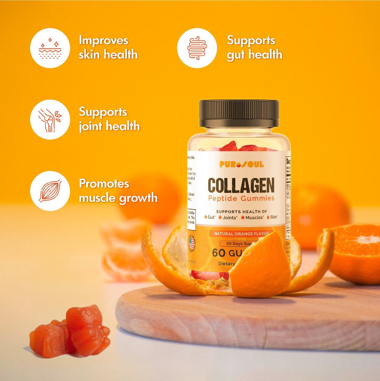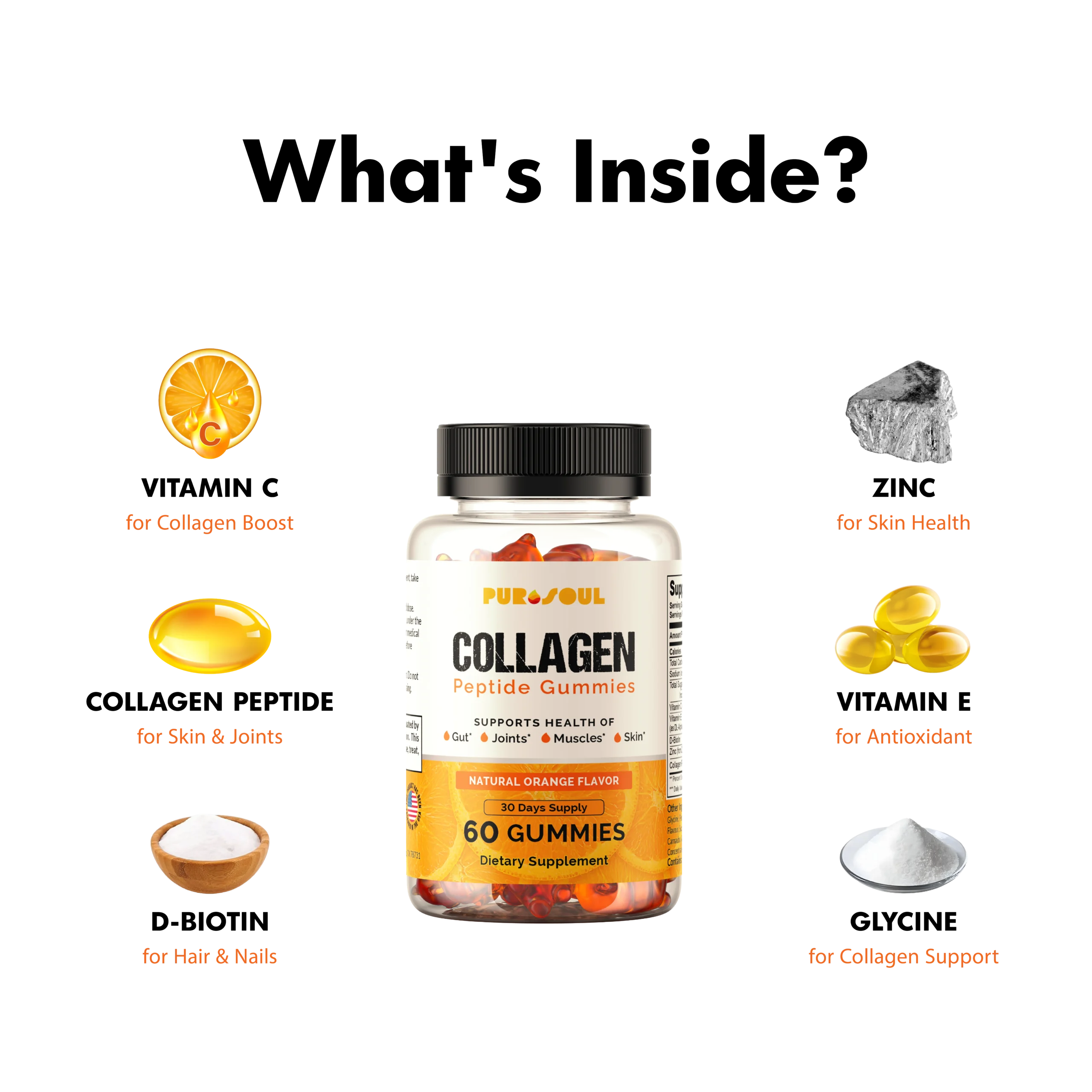 PuroSoul Collagen Gummies make it easy (and tasty!) to restore what time takes away. These chewy orange-flavored gummies deliver Collagen Peptides paired with Vitamin C—an essential nutrient that enhances collagen absorption for stronger bones and glowing skin.
