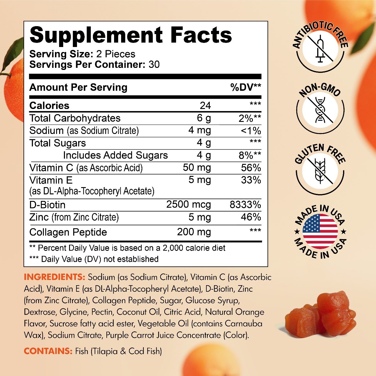 - Vitamin C (Ascorbic Acid) – Enhances collagen absorption and supports immunity
