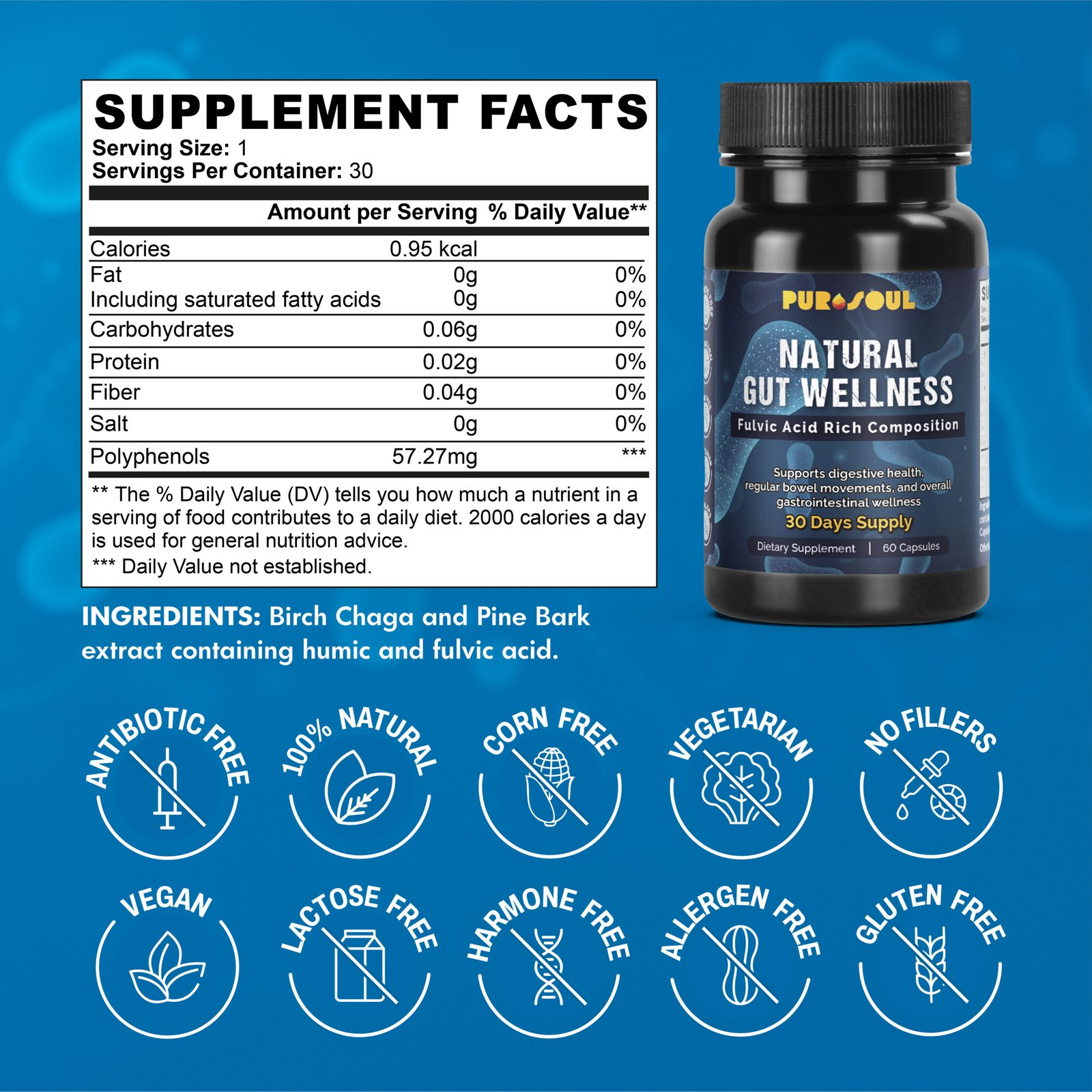 Your gut does more than digest food—it’s the foundation of your immune system, energy levels, and mood. PuroSoul’s Natural Gut Wellness Capsules with Fulvic Acid are expertly formulated to bring balance and harmony to your digestive system using the power of natural ingredients.